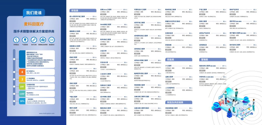 作为“围手术期整体解决方案提供商”,业务涉及药物输注、体外诊断、气道管理、深静脉血栓预防、高值耗材等领域;全球1200+员工,公司处于高速发展期,计划未来两年内上市。本次校招我们有四大类型岗位,两百多个HC,总有一款适合优秀的你