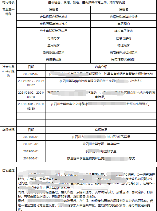 1、 填写注意事项:表格中所有空格一般都要填写,尽量不要有空格,特别要认真写自我鉴定(思想、学习、实践、公益)等,兴趣爱好栏,填写时请认真,如:钢琴、围棋、舞蹈、足球等,不要随意填写。自我鉴定不少于200字(思想、学习、实践、公益)等。