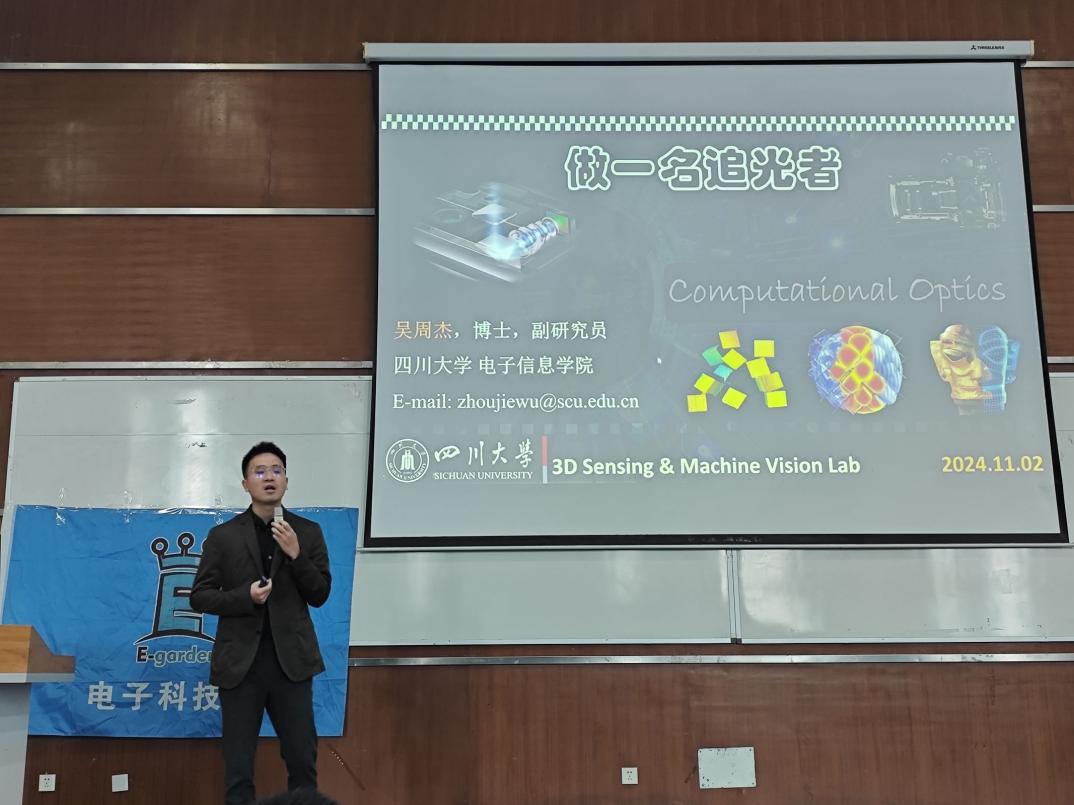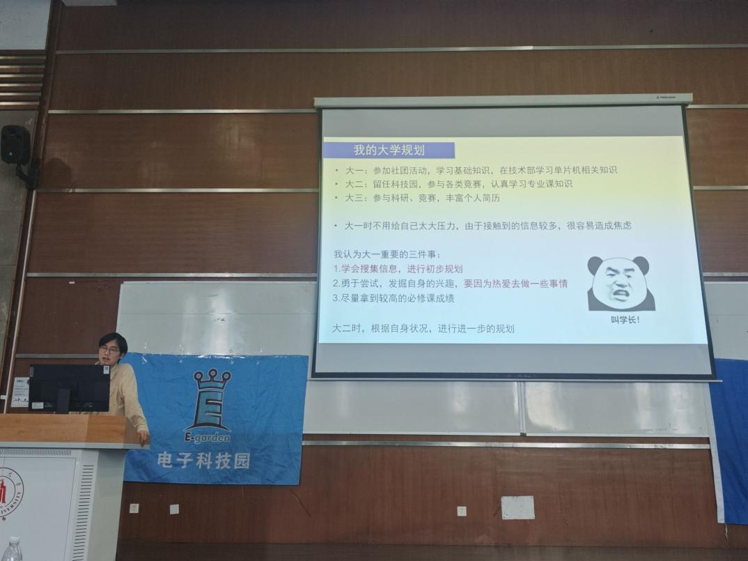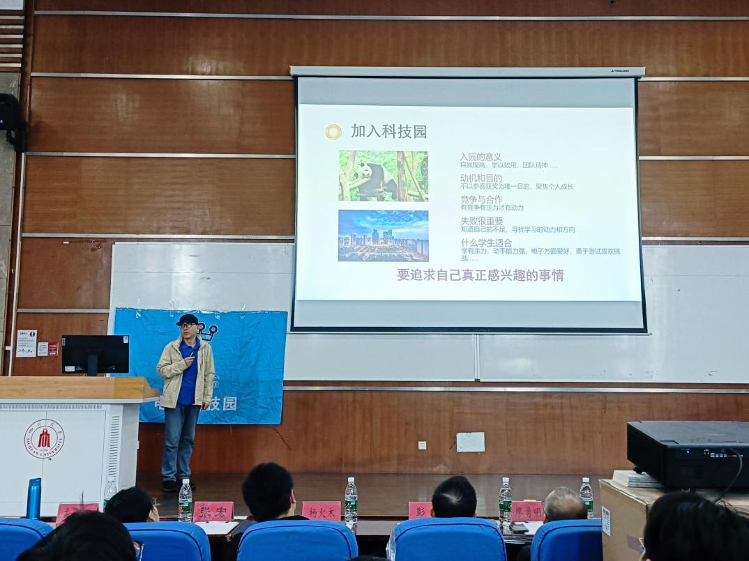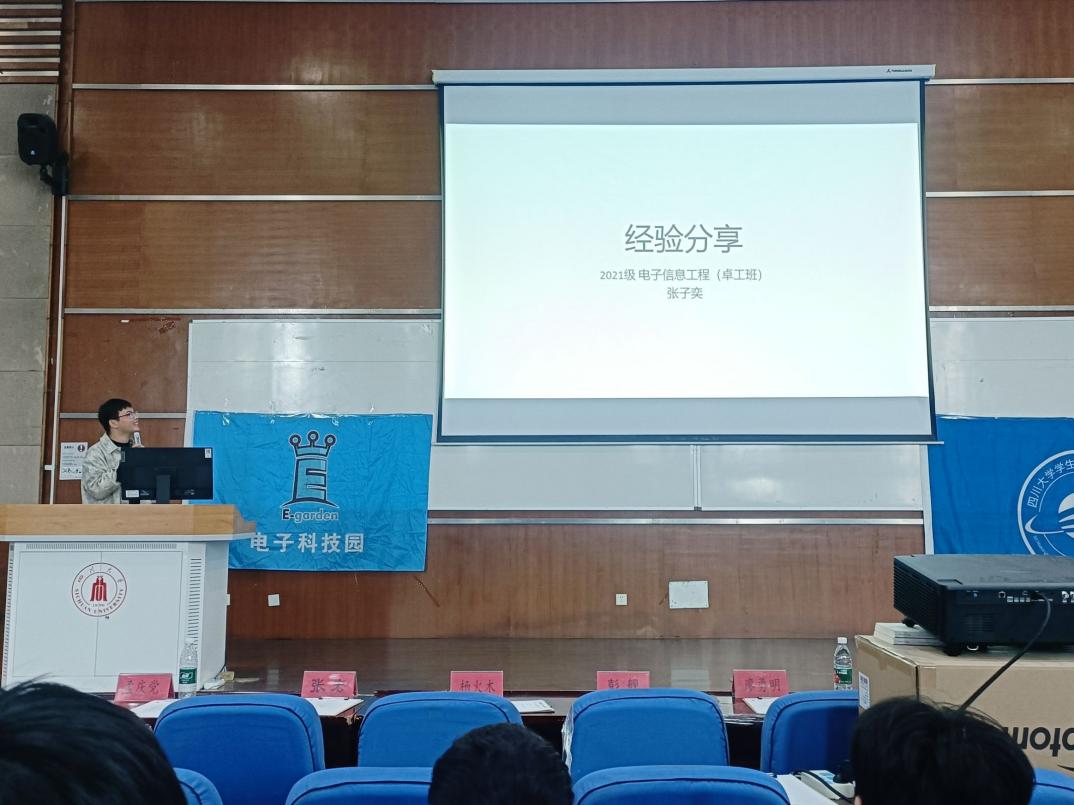 老师分享。孟庆党老师聚焦于个人能力的发展,介绍学习经验,并侧重介绍了川大提供的学术性科研平台,深入竞赛部分,提出“以学备赛,以赛促学”的竞赛宗旨,鼓励学生有计划有目标地参加各种竞赛活动。接着吴周杰副教授分享个人科研经历,与同学们深入交流,同时讲述了光电等相关专业的科研以及工作前景。大会第三项,优秀学长交流心得体会。张子奕学长生动有趣地讲述自己的学习、竞赛、保研等经历,分享个人感悟。肖迪学长则专注于电子类竞赛的分享,详细介绍各种竞赛,并对本科四年的竞赛安排进行分析,就如何合理分配时间、提高个人综合能力提供了宝贵的建议。大会第四项,问答环节。现场的同学们踊跃提问,学长们耐心细致地解答了同学们关于学习方法、竞赛规划、科研经验等方面的疑问,不仅帮助同学们澄清了疑虑,也让他们更加明确了自己未来在大学期间的努力方向。至此,电子科技园2024会员大会暨信息科学技术分享会圆满结束。