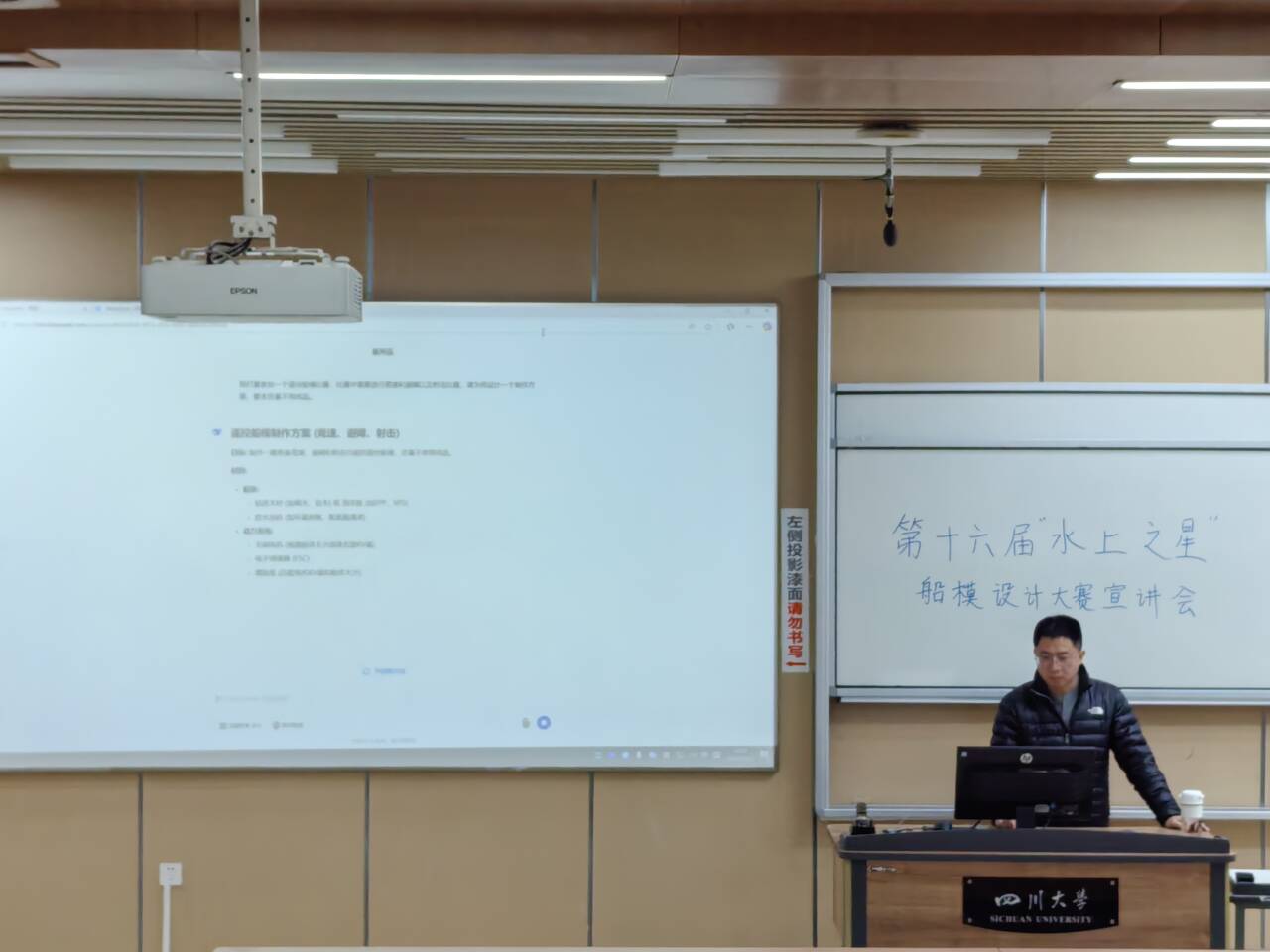 在江安校区综合楼C103举办“水上之星”船模设计大赛的第二次宣讲会。本次宣讲会特别邀请了上届船模设计大赛的评委陈雨老师,为同学们解答疑问,并分享答辩的要领和技巧。