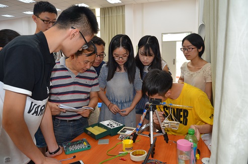 船模协会、电子竞赛协会等二十余个学术型社团的通过7月16日选拔的同学,测试主要根据省电子设计竞赛的四个题目要求进行,省电子设计竞赛的题目分别为降压型直流开关稳压电源、自动循迹小车、脉冲信号参数测量仪、简易电子秤等四个题目,测试老师分别根据题目的要求,对参赛队伍完成的作品逐一进行了测试。