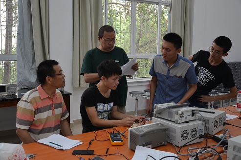 的指导老师对参加本次四川省电子设计竞赛的同学完成的作品进行了校内测试,参加本次测试的有副院长周新志教授、徐家品教授、王正勇副教授、华伟副教授、植涌老师、夏文龙老师、孟庆党老师、刘俐老师、陈晓娟老师以及李运国老师。