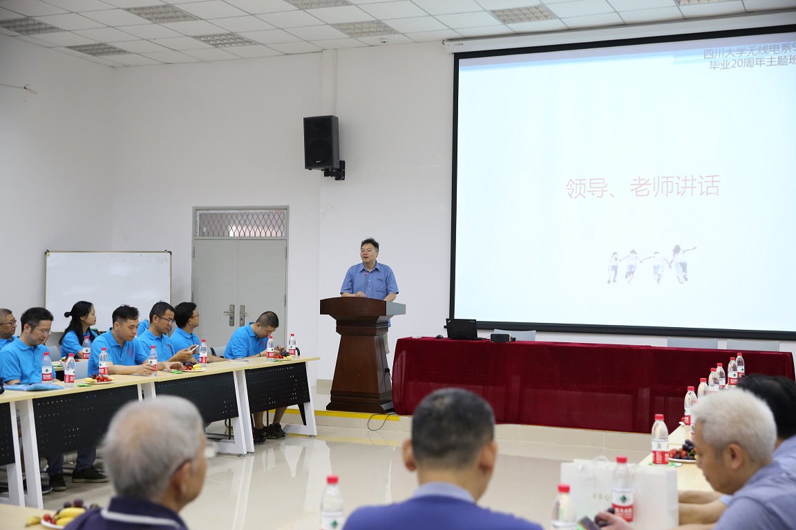座谈会在蒋姝亮和彭海涛校友以“相约2018,激情无线20年”的主题,在共同回忆校园美好生活的氛围中拉开帷幕,两位校友回忆到他们是四川联合大学第一届招收的学生,也是四川联合大学最后毕业的一届学生。和在场的全体师生一起回忆了在四川大学期间的难忘生活。